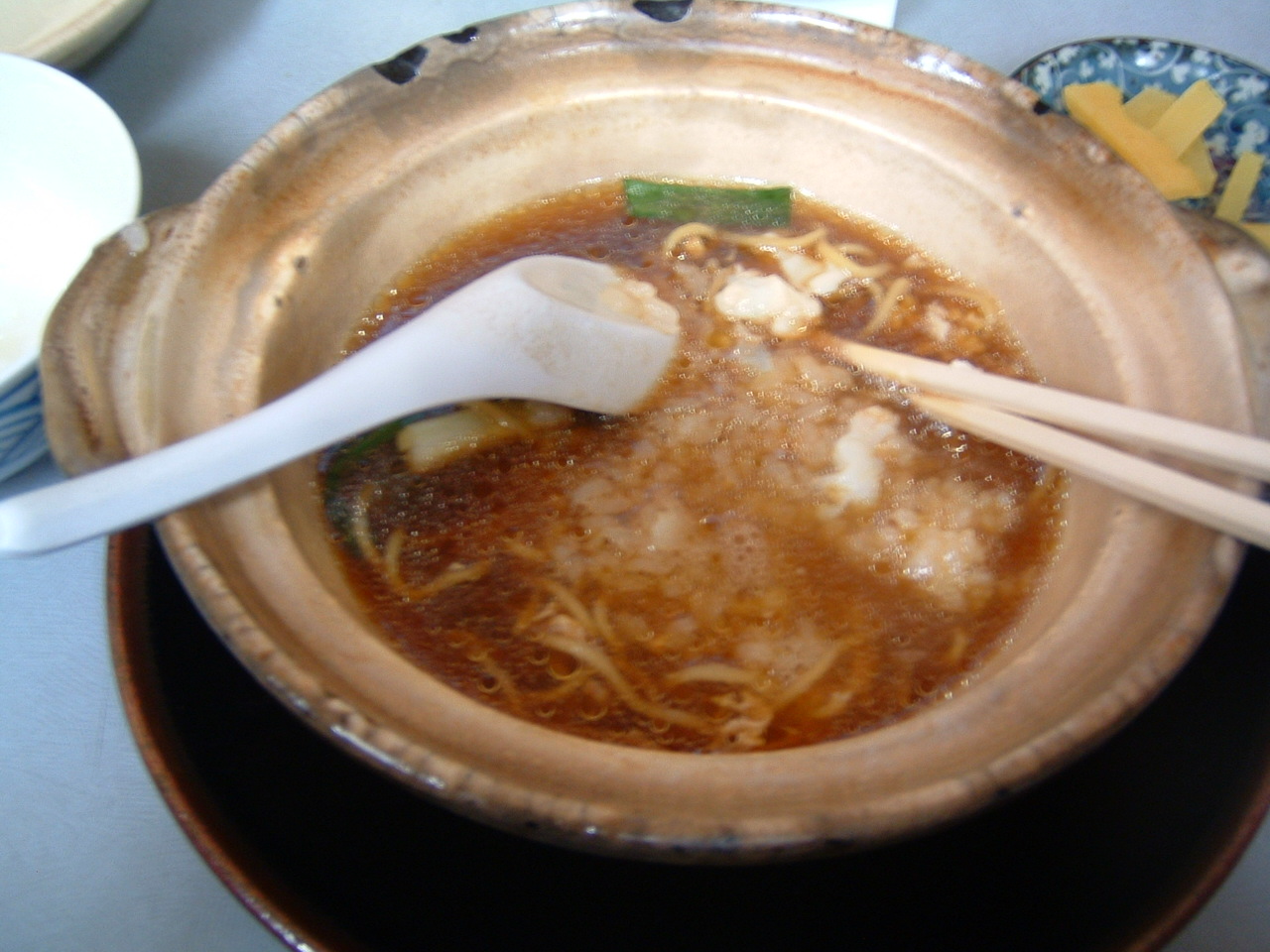 高知旅行記 ⑨ 美味しいもの 2009年12月11日 須崎駅 街の気が南国っぽい 雰囲気を醸し出します。 ハッキリ言って過疎の町です。 須崎市の町興しとして始まった 鍋焼きラーメンのPR。 有名な店は橋本食堂とまゆみの店。 橋本食堂は残念ながら平日のみの 営業なので、今回はまゆみの店に行きます。 駅から歩いて15分。 人が居ません。 少々心配になってきます。 まゆみの店に到着。 ギョ、行列です! 駅からこの店まで歩いて見かけた町民 わずか2人。 店の周りには15人以上の行列があります! 連休恐るべし! 鍋焼きラーメン恐るべし! 期待が高まります! 30分弱並んで入店。 有名な店ですが、気さくな感じの良い店です。 溢れる湯気でカメラがぼやけ気味です。 あったまった生卵をご飯に入れ、 半熟賭けご飯に!!! ウマイ! さらに、鍋にラーメンをぶち込む!!! 激激うまい!!! この超下品な食べ方をしている オイラを、隣のカップルの女の子は 『マジ?!』って感じで見下ろしていたのですが、 上の写真のおじや状態を 俺が食べているのを見て…。 カップル男のほうが、 『あ~、オレ、我慢できねぇ!』 っと、全く同じ食べ方をして 食べていました。 彼女のほうも、最後のブッカケご飯を真似していました。 半熟卵ご飯はまだしも、 ブッカケご飯は お店の推奨の食べ方ですからね。 やらなきゃ損です! 食べ終わった後も列があります。 更にもう1軒。 うどんは5杯食べた俺でも、 鍋焼きラーメンは2杯が限界! しかもご飯は無しです。 写真の移りはハッキリ言って 『だるま』のほうが綺麗ですが、 美味しさはまゆみの店のほうが上でした。 鍋焼きラーメンって 『土地興しラーメン』なので レシピは一緒なはずのですが、 隠し味であるしょうがの扱いや 鶏肉の扱い方、灰汁ぬきの丁寧さなどで かなり味が変わってくるのだなぁと実感。 そして行列の出来る店は 人知れず努力をしていて、 それを客も見逃さないのだなぁ と改めて実感しました。 見ている人は見ている! 念頭に置きながら、 手を抜かず、 頑張っていきたいものです。 http:// [0回]